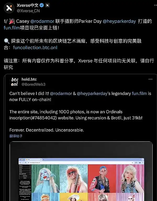 ● Casey @rodarmor 与摄影师 Parker Day 合作推出了 fun film 项目,将 1000 张 Cosplay 照片通过 Ordinals 铭刻上链,打造独特的区块链艺术画廊。整个网站体积仅 31KB,使用递归技术与 Brotli 压缩,实现轻量化展示。FUN 系列为 0 号铭文的子铭文,传承清晰。摄影师 Parker Day 的作品广受**赞誉,现居洛杉矶。by @Xverse_CN