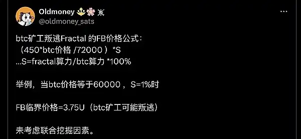 ● @oldmoney_sats 的 FB 挖矿价格公式,(450BTC 价格 /72000)S 其中 S=fractal 算力/BTC 算力 *100%。举例,当 BTC 价格等于 60000,S=1% 时,FB 临界价格=3.75U(BTC 矿工可能撤退)未考虑联合挖掘因素。非官方计算方式 DYOR