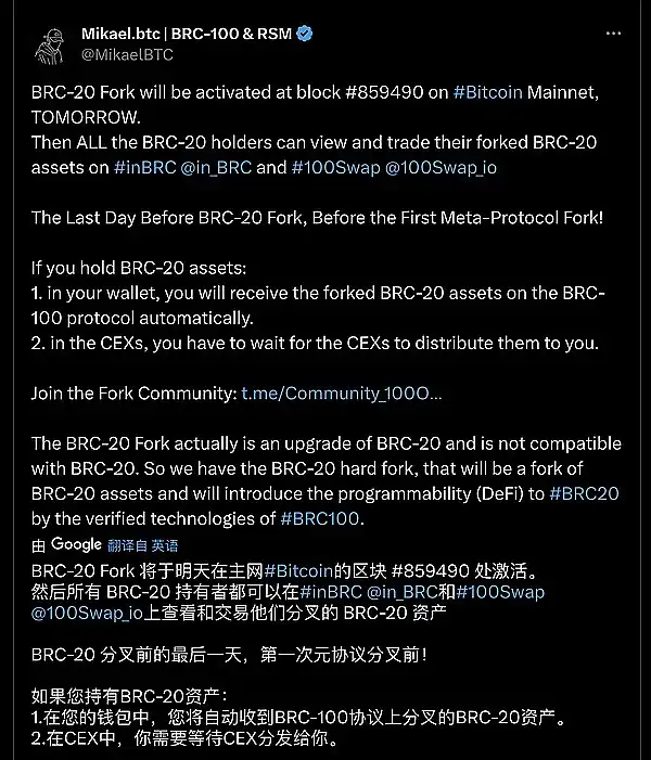 ● BRC-20 Fork 将于明天在主网 Bitcoin 的区块高度 #859490 处激活。这次分叉是硬分叉不兼容,并将通过 BRC100 经过验证的技术将可编程性 (DeFi) 引入 BRC20 和 BRC100。@MikaelBTC
