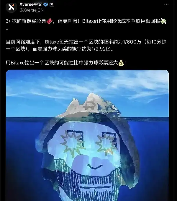 ● Xverse @Xverse_CN 表示,对于 OMB 乐透矿机,在当前网络难度下,Bitaxe 每天挖出一个区块的概率约为 1/600 万,而赢强力球头奖的概率约为 1/2.92 亿。