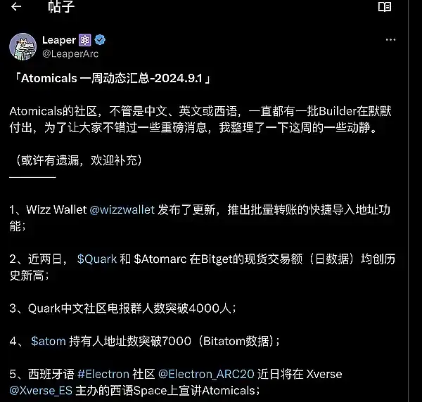 ● @LeaperArc 制作 Atomicals 周汇总。Atom 持有人突破 7000,Quark 中文电报人数突破 4000,Dev 持续建设,多个 KOL,媒体,海外社区多方面宣传,Ordinals World 每日 BTC 生态新闻大**(设有 ARC20 资讯专区)由 Xverse 官方账号同步更新到金色财经和律动。