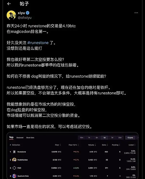 ● 符石 runestone 的日交易量为 4.19 BTC,持续在 @MEonBTC Ordinals 板块排名**。