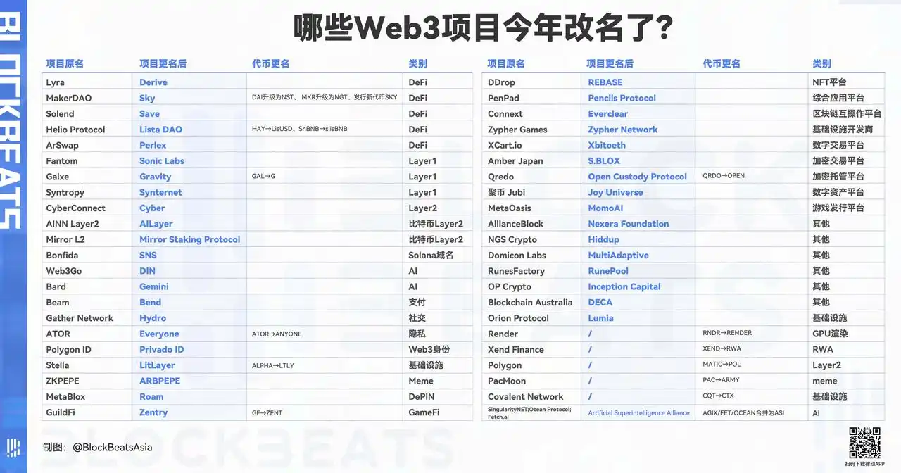 纵观加密周期更迭,项目更名、合并、或者**换名等操作屡见不鲜。据律动 BlockBeats 不**统计,仅今年以来涉及到协议、项目或者**名变更或合并的项目就多达 40 余个。除 MakerDAO 外,还有 Galxe(现更名 Gravity)、Helio Protocol(现Lista DAO)、Polygon(**名变为 POL)等知名协议和平台都进行了名称(或**)的变更。
