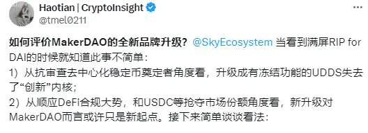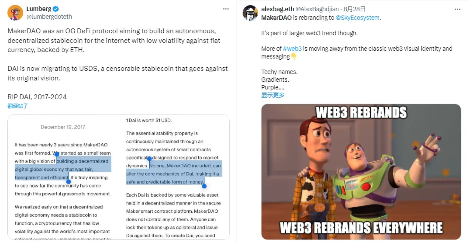 上周,MakerDAO 正式更名为 Sky Protocol,并将把自己的**和稳定币升级为 SKY 和 Sky Dollar(USDS)。此举引来不少老用户的「diss」,除了吐槽团队不专业、原 X(推特)账号没有妥善处理外,更多人认为新名字毫无特色,甚至失去了 Web3 的特点,更像一家 Web2 科技公司,不如 MakerDAO 令人印象深刻;还有 KOL 直言团队已经违背了去**化的愿景。