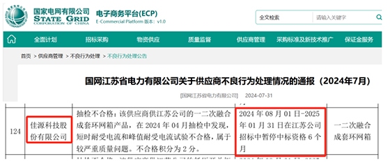 除了迟迟未提交注册外,国网江苏省电力有限公司近期发布关于供应商不良行为处理情况的通报,其中佳源科技抽检不合格。受此影响,佳源科技一二次融合成套环网箱2024年8月1日-2025年1月31日在国网江苏招标中暂停中标**6个月。