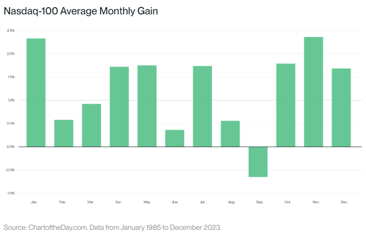 比特币并不是**受苦的资产。自 1929 年以来,九月是**一个股票下跌次数多于上涨次数的月份。这种效应在以科技股为主的那斯达克 100 指数中尤为明显。
