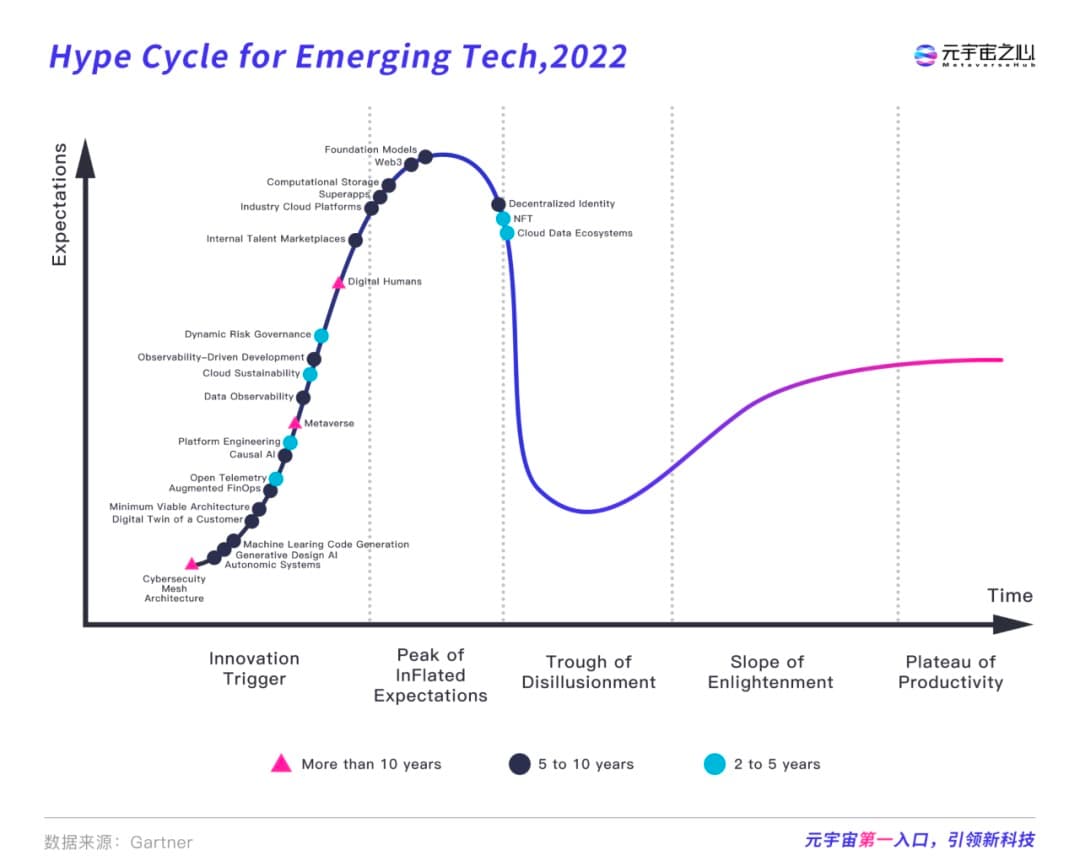 而在Gartner发布的“2022年新兴技术成熟度曲线”从图中可以看出,该描述已经验证(见下图),NFT从泡沫期的**逐渐接近幻灭期。