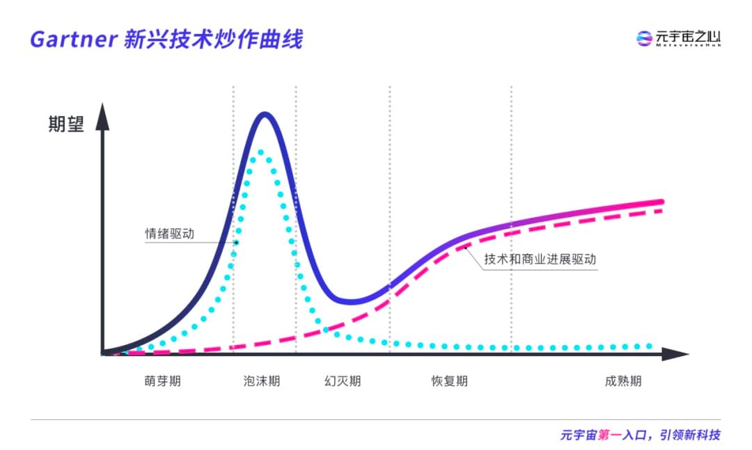 从下图中我们来看这个知名的“新兴技术炒作曲线(周期)”从新技术出现时的发展轨迹来看,该图更好地描述了一项新技术的发展轨迹。“萌芽期”到“泡沫期”,再到“泡沫幻灭期”和“恢复期”,还有**一个“成熟期”。