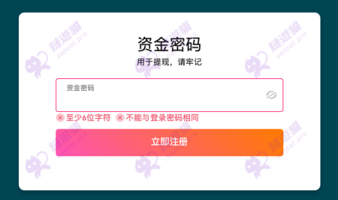 步骤二:设置“资金密码”,并点击“立即注册”。注意:资金密码至少6位字符,且不能与登录密码相同。