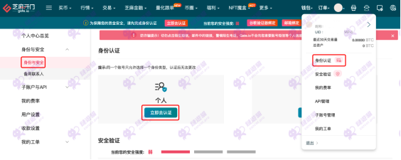 1、登录Gate.io个人账户,点击“头像”——“身份认证”——“身份与安全”——“个人认证”——“立即去认证”进行认证。