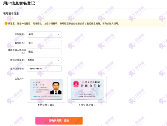 根据页面提示,依次填写(国籍/姓名/证件信息) 信息,上传本人证件的正面和反面照片,检查信息无误后点击“已确认无误,提交”即可。