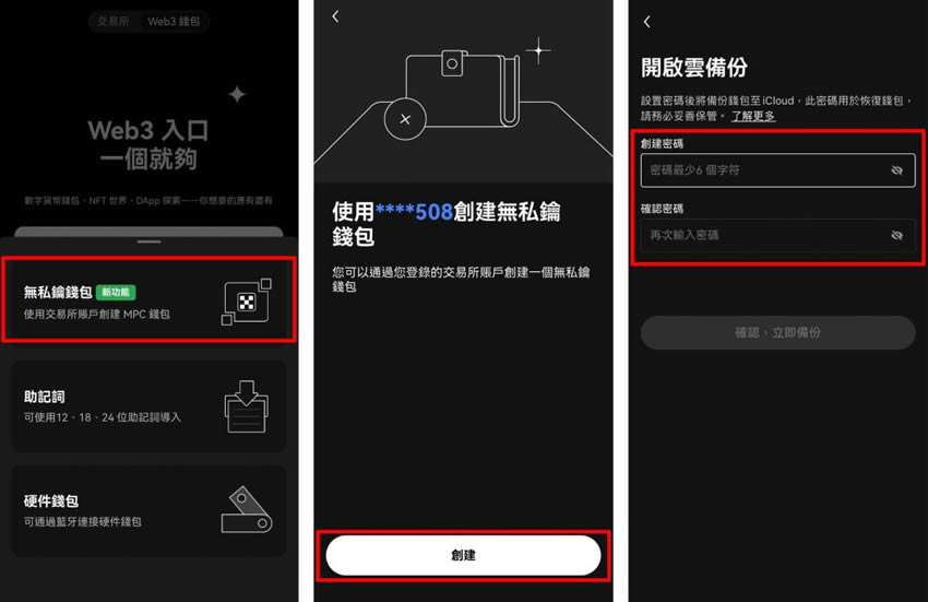 在创建钱包时你需要另外登入 OKX 交易所才能够选择以无私钥钱包方式创建,也请务必要开启云端备份来备份你的第三份碎片。