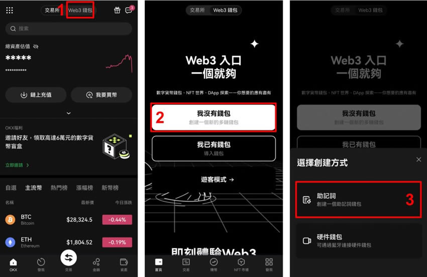 接下来我们打开 OKX App 切换到 Web3 钱包首页进行「注册」,也就是建立一个属于自己的多链钱包,还没使用过去**化钱包的话请选择以助记词方式建立,如果已经有冷钱包或是在其他地方例如 MetaMask 创过的话可以在第二步选择导入钱包。