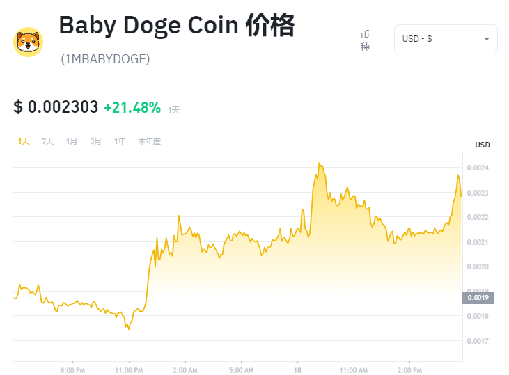 今日Baby Doge Coin的实时价格为$ 0.002303(1MBABYDOGE/USD),当前市值为$ 0 USD。24小时的成交量为$ 135.16M USD。1MBABYDOGE兑换USD的价格实时更新。Baby Doge Coin过去24小时内涨跌幅为 21.48%,流通量为0。