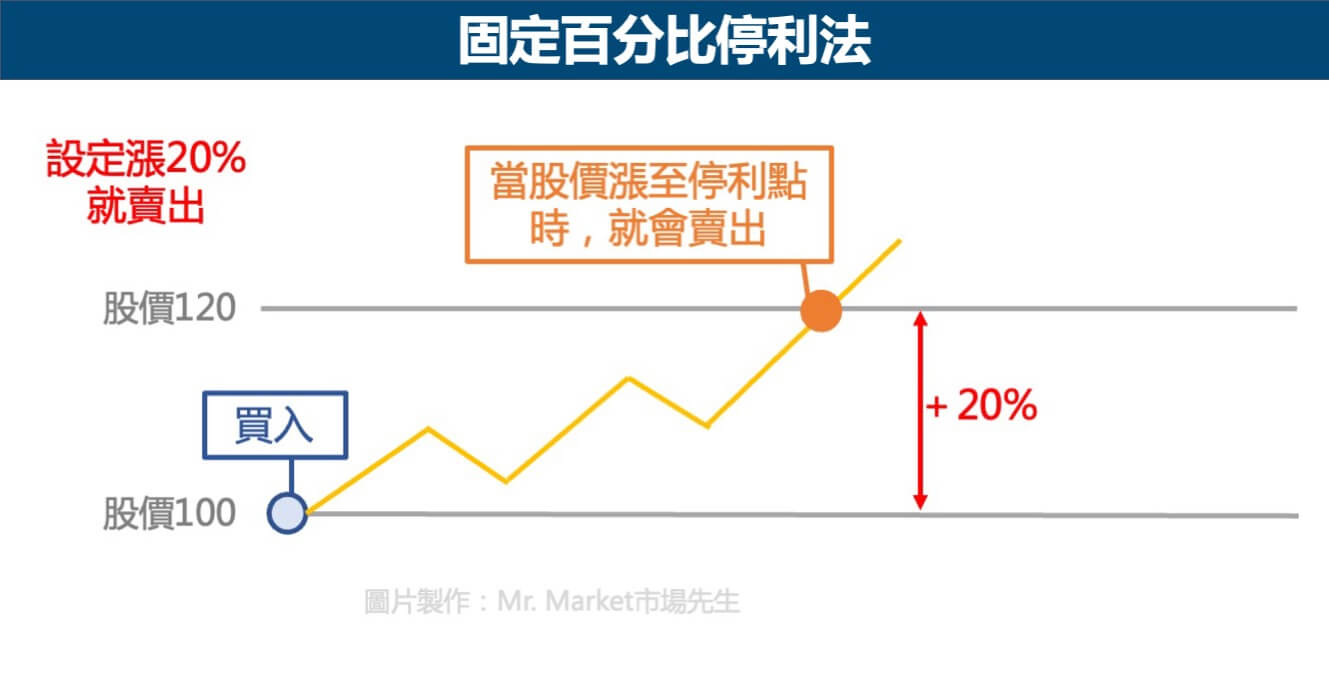 固定百分比止盈法(英文:Take profit at a specific percentage)就是设定一个固定的百分比数字,例如10%、20%或30%,做为止盈点,只要获利达到这个百分比,就会卖出获利了结,这个数字依个人的风险承受度而定。