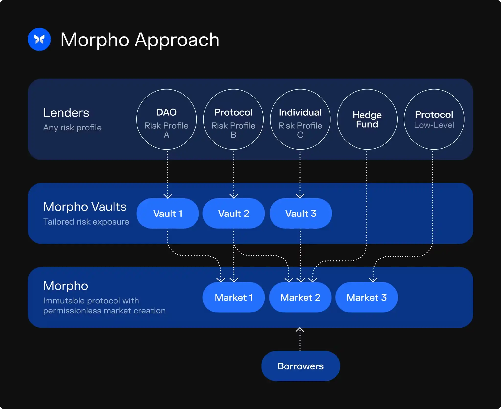 就像是用户在做资金配置一样,绝大部分选择稳健型投资,一部分可能会选择风险偏好高的投资,如今在 Morpho 中,金库与市场的组合,为用户带来了合理进行资金配置的方法。Morpho 并不会将资金分散到其他协议中。资金始终在 Morpho 内部进行流动。具体来说,资金的路径是从出借人到 Morpho 金库,再到 Morpho 市场。**一方协议的黑天鹅也不会产生 100% 的资金流失。
