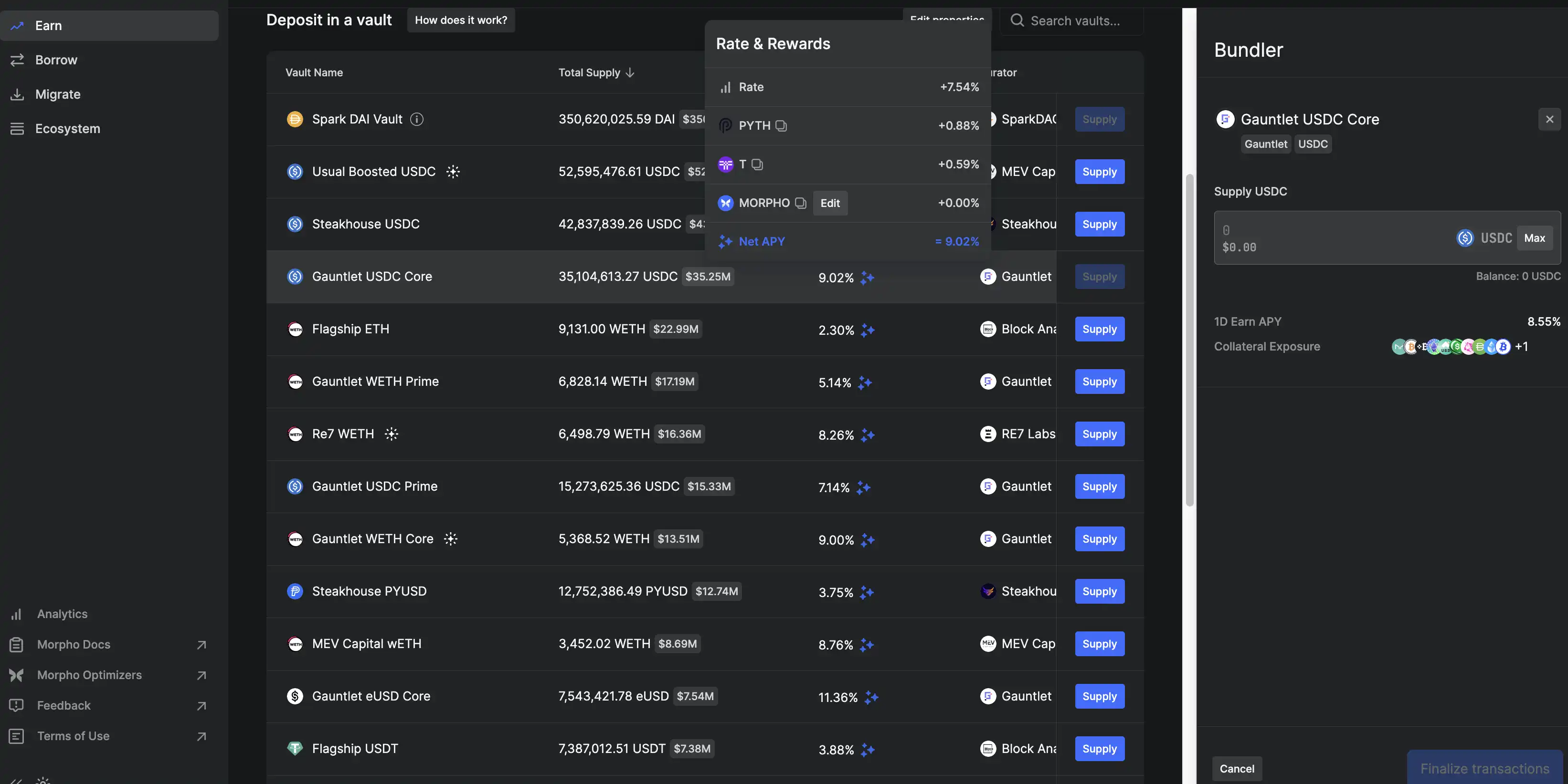 对于存款用户来说,在 Eran 页面通过搜索功能可以直接筛选出你需要的资产,存入资产后,不仅可以赚取借款人支付的基础收益,还可以获得 MORPHO **和由第三方提供的其他奖励。利息在从金库提现时发放,奖励则每月在奖励页面发放并可领取。
