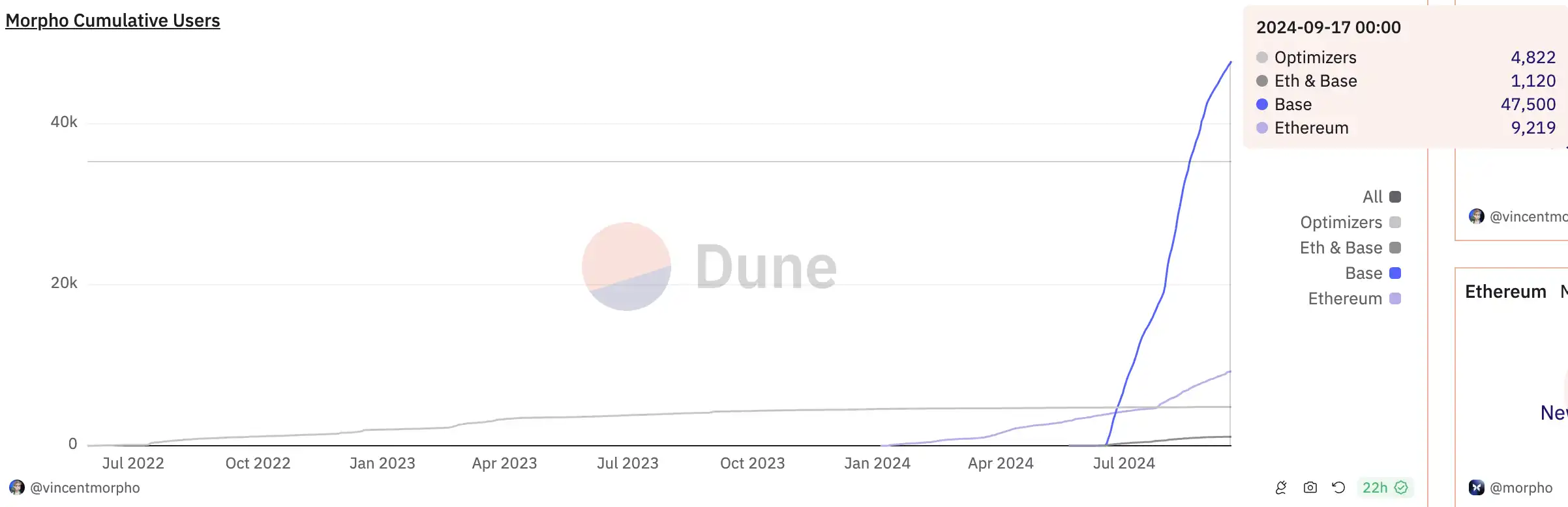 在今年上线 Base 网络后,Morpho 在 Base 网络的累计地址量已经超过 4.5 万。相较于更早版本的地址数,如今的 Morpho 有了数量级上的提升。