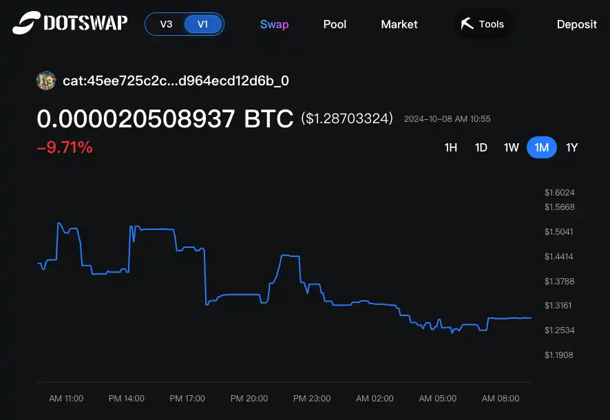 而 CAT20 在 OP_CAT 上的研究上极深,因此 CAT20 的低调只维持了短短几小时,随后便迅速在社区中口口相传,引发了极大关注。在铸造的几天内,分型网络的矿工费率一度飙升至 5000 sats/vb。据 DotSwap 数据显示,当前一个 CAT **的价格维持在 1.28 美元左右(一张 9.2 美元)。早期铸造者的收益实现了 5 到 40 倍的涨幅。