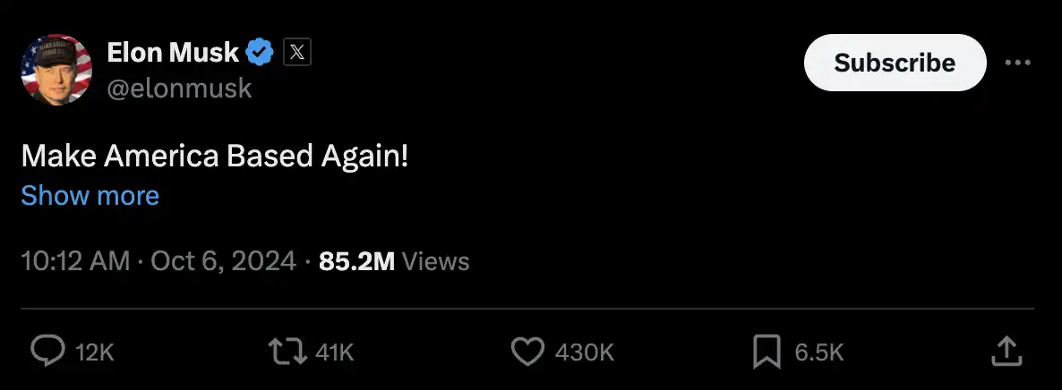 10 月 6 日,特朗普携手马斯克重返宾夕法尼亚州巴特勒市并举行了一场竞选集会,二人同框发言,多个系列 MEME **上涨。马斯克还于社交平台发文「Make America Based Again」。