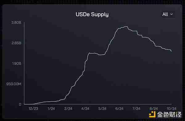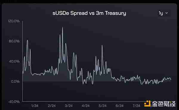 参考上述两张图表,可以明显看出,对 USDe 的需求对美国国债收益率溢价高度敏感。在收益率溢价上升的前 6 个月,USDe 供应量猛增。随着溢价下降,对 USDe 的需求自然也逐渐减少。有了这些历史数据,我相信收益率溢价的回归将导致 USDe 增长再次加速。重要的是,这种顺风既容易理解,又对大多数市场参与者有吸引力。