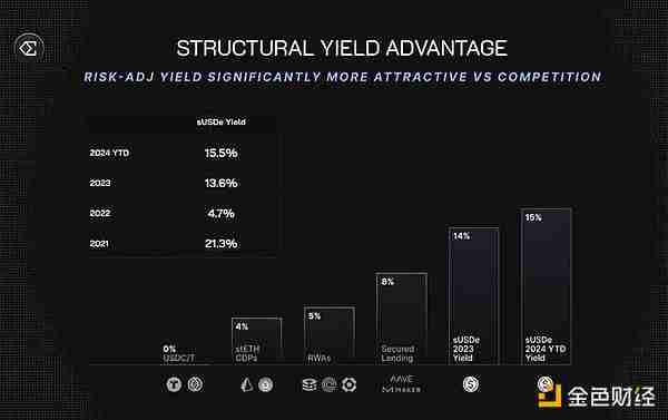 自 Ethena 成立以来,sUSDe 的相对收益率溢价平均为联邦基金利率的 5-8%。这一结构性优势使得加密货币领域数十亿美元的收益寻求资本在推出后的前 9 个月内流入 Ethena。
