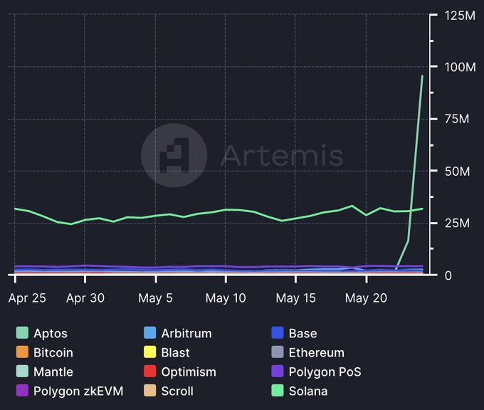 Aptos 在区块链交易方面取得了新的里程碑,单日交易量达 9660 万笔,超越Solana ,而 Solana 为 3170 万笔。