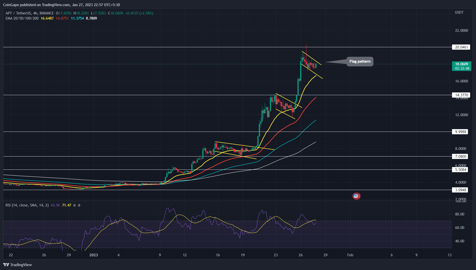 Aptos 价格预测:每日时间框架图显示Aptos **价格自 2023 年初以来呈抛物线式反弹。截至发稿时,**价格为 17.8 美元,在过去四个星期内上涨了 482%。然而,价格分析通过重复形成称为旗形的看涨模式来证明这种增长是合理的。以下是这种看涨的延续模式如何影响 Aptos 的未来价格。