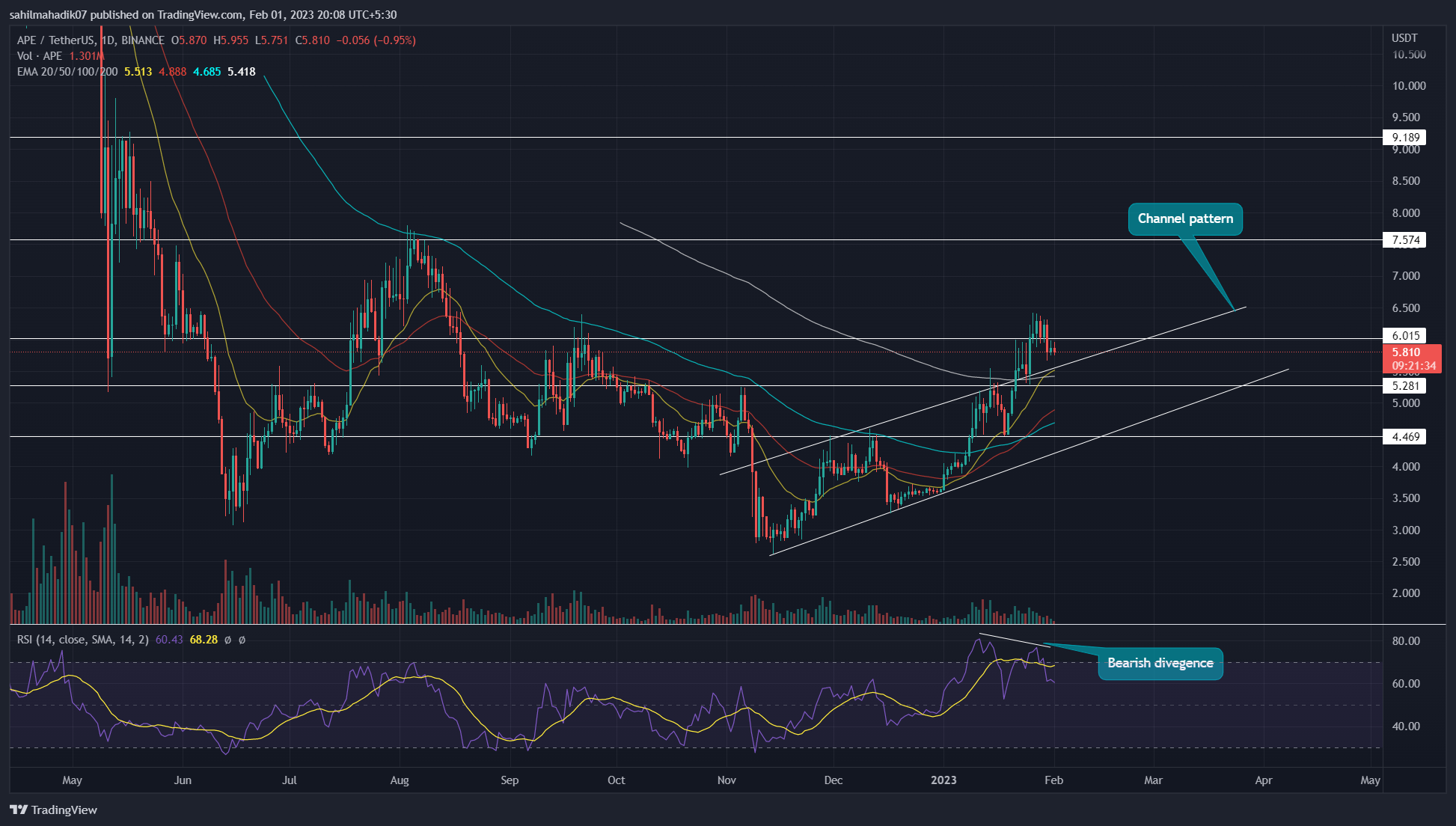 上升通道形态的看涨突破是极端看涨状况的标志。结果,重新测试后的反弹使**价格飙升 18%,达到 6.4 美元大关。然而,由于即将召开的 FOMC 会议导致加密货币市场普遍存在不确定性,APE 买家未能维持在较高水平。