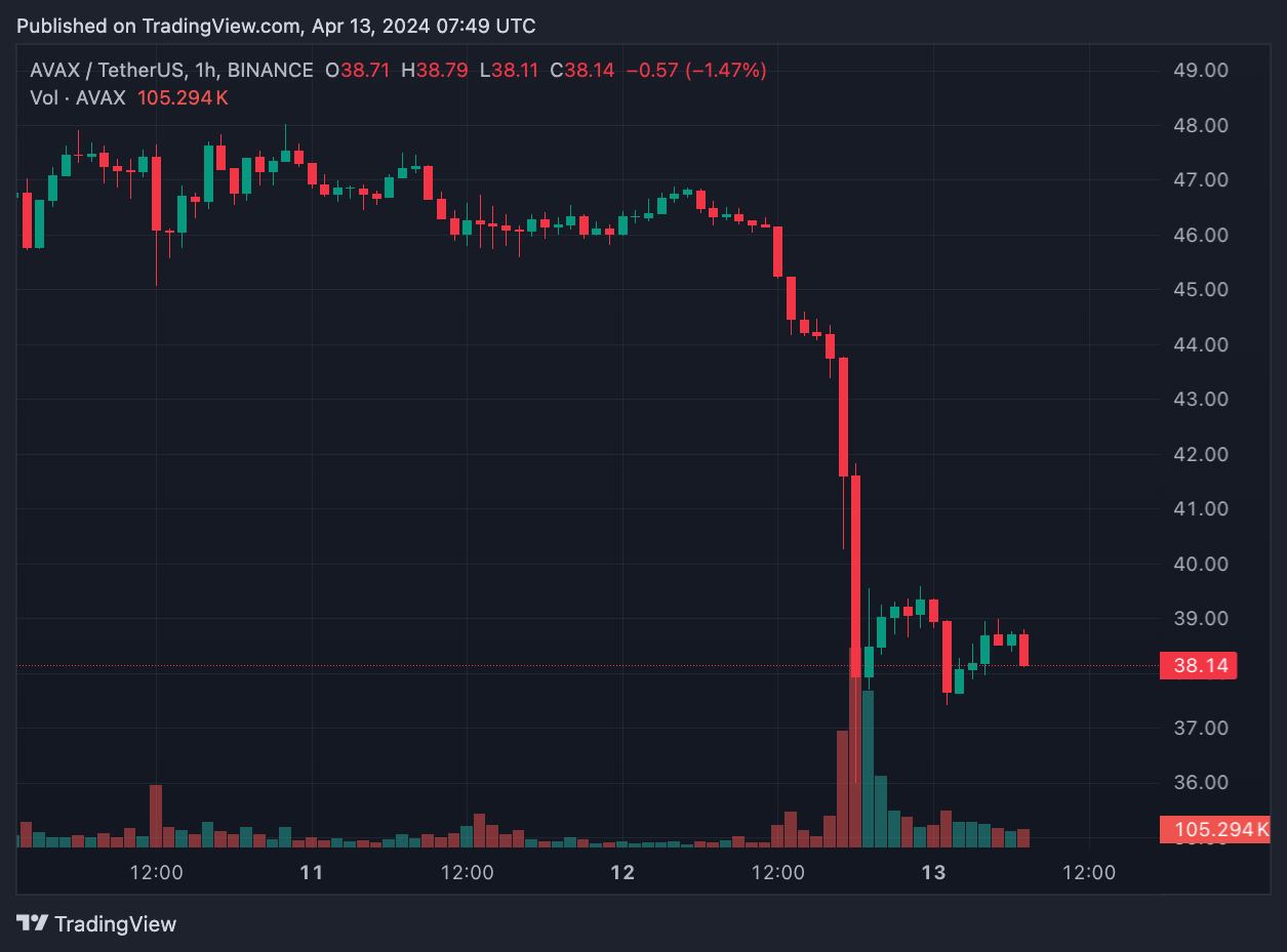 AVAX 价格在过去 7 天下跌了近 19%,目前交易价格为 38.14 美元,市值超过 145 亿美元,成为第 12 大加密货币。