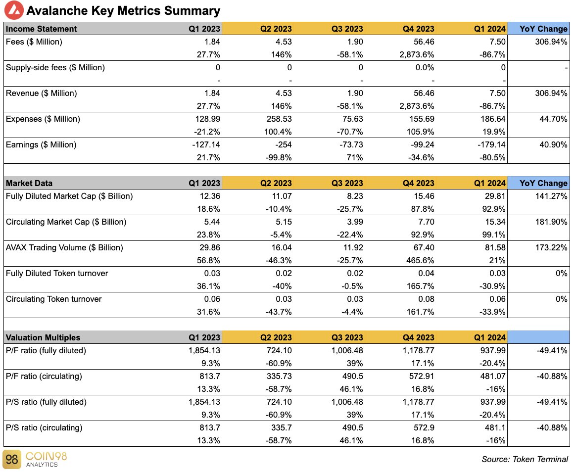 然而,将 2024 年**季度的统计数据与 2023 年**季度的统计数据进行比较时,Avalanche 的费用和收入翻了两番。