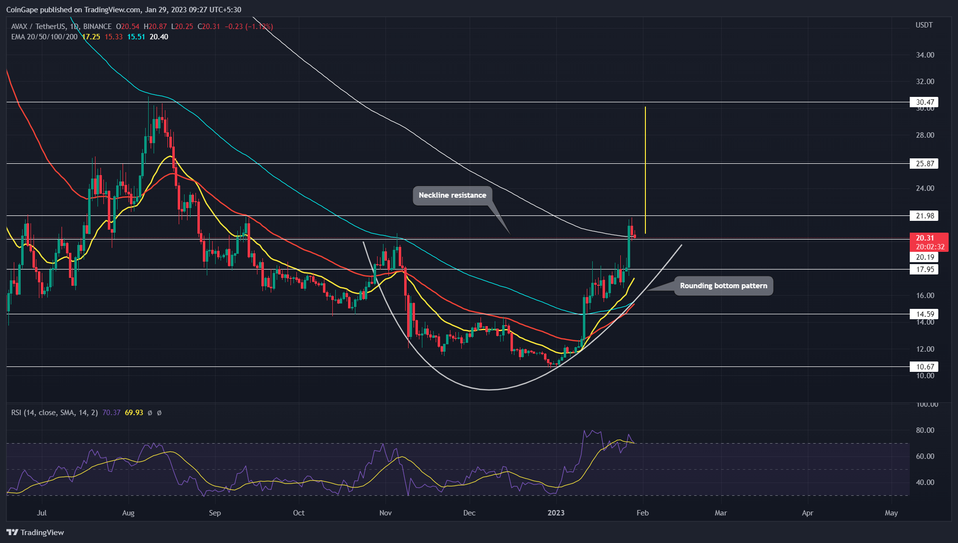 加密货币市场的 U 型复苏预示着圆底形态的形成。这种看涨逆转模式通常在市场底部观察到,并为**持有者提供持续复苏。因此,随着市场的持续复苏,雪崩硬币价格最近突破了该形态的关键颈线阻力,表明价格已准备好起飞。
