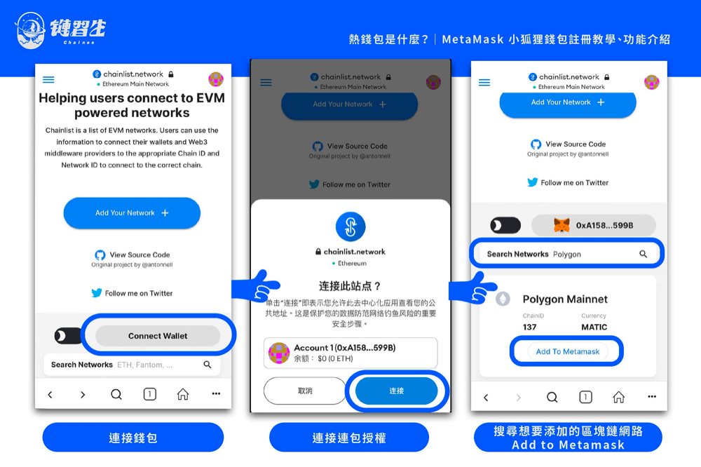 接着,点击「Connect Wallet」将MetaMask 钱包连接到 Chainlist网站(站点)。然后使用检索功能搜寻你想要添加的区块链网路。我们以Polygon 链为做为示范,按下「Add to Metamask」继续。