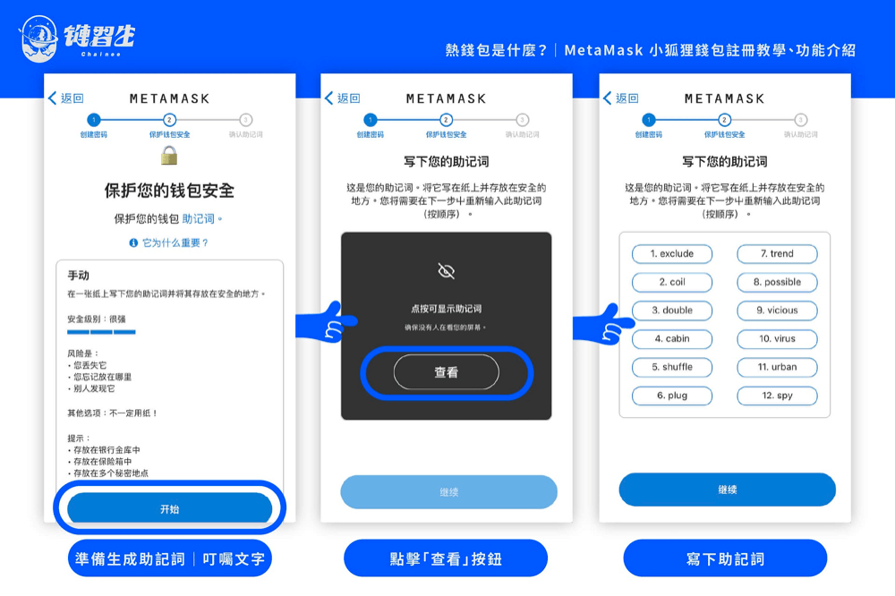步骤一:创建新钱包看完说明影片后,就是最重要的「生成助记词」环节。这12 个英文单字建议使用纸本抄写,以免存在记事本软体有遭骇的疑虑,日后在其它装置还原钱包也会需要导入助记词。