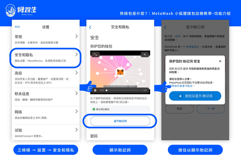 步骤二:介面导览基于某些理由,例如弄丢当初抄写助记词的纸本,我们可能会想要重新查看助记词。可至「设置→ 安全与隐私→ 显示助记词」里找到。