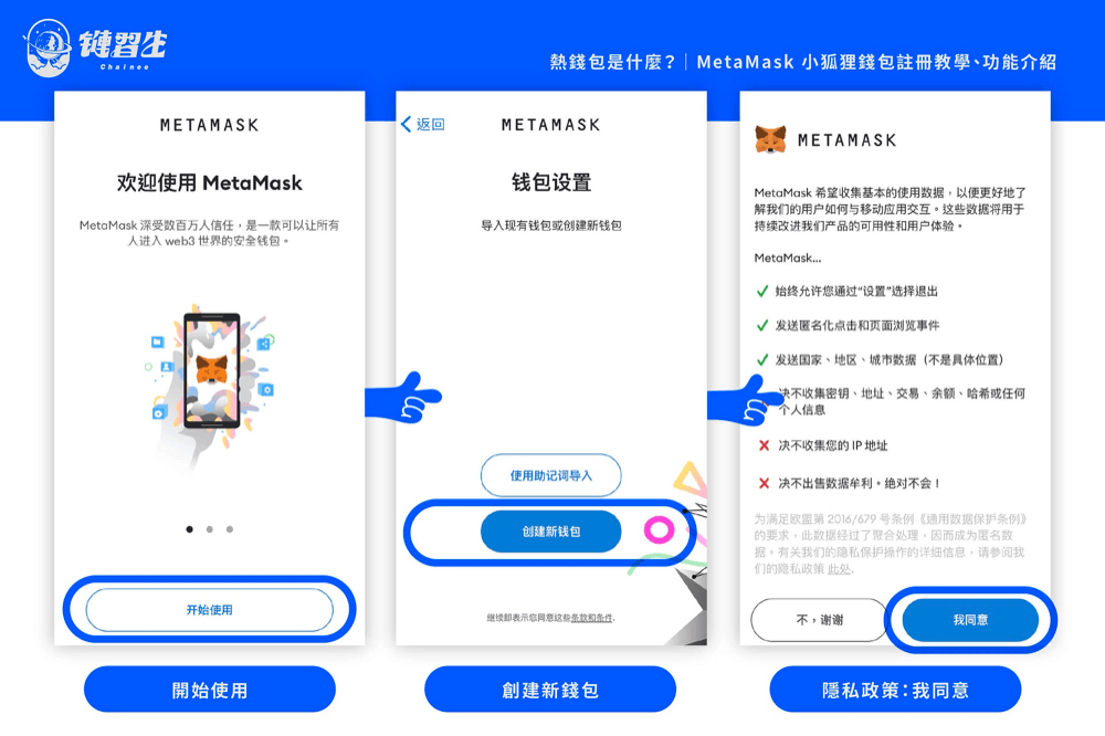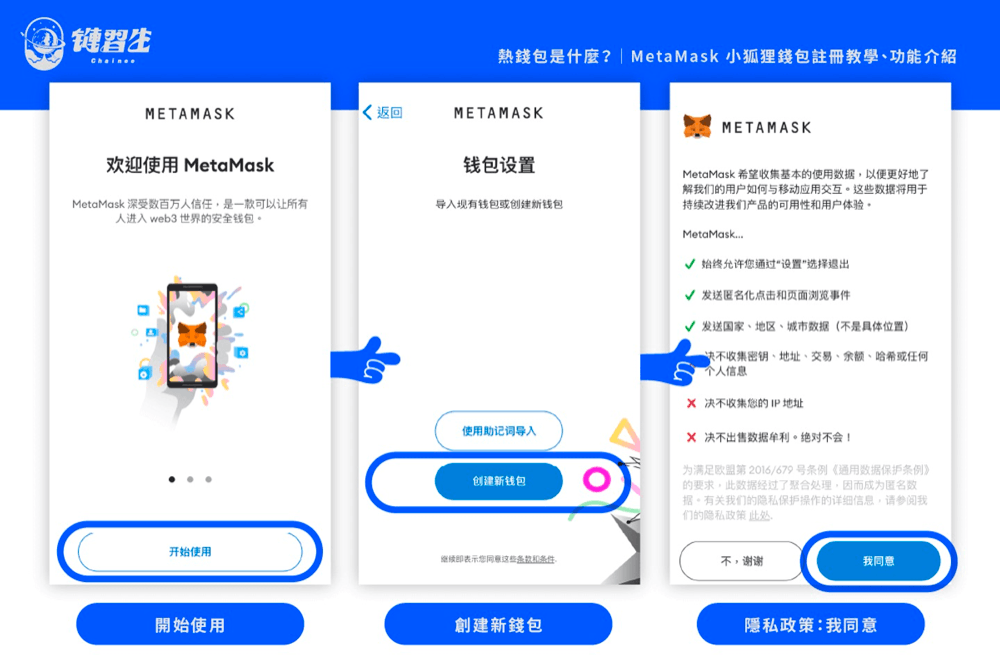 步骤一:创建新钱包打开MetaMask App 后预设进入「钱包」页面,以数字标记,为大家导览介面: