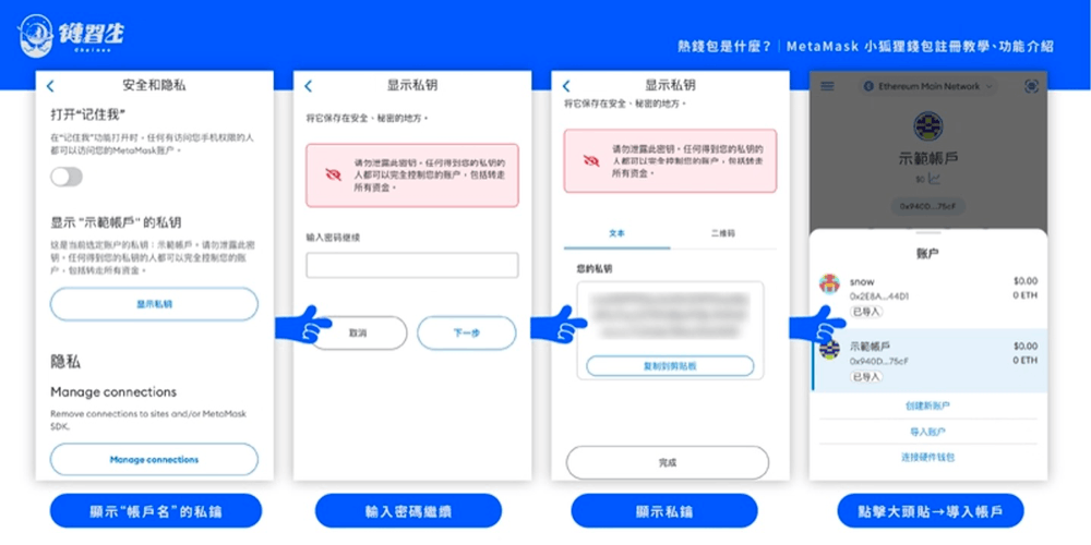 . - 导入帐户如果我们在不同手机上安装MetaMask App,这时可透过私钥来还原你的帐户,只要在首页点击大头贴,然后选择「导入帐户」即可。