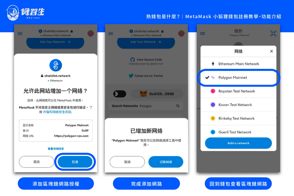 步骤三:添加区块链网路by Chainlist过程中,系统要求「批准」添加Polygon 链,确认后,回到「钱包」页面的「网路」里查看,已经如实成功地添加了Polygon 区块链网路。