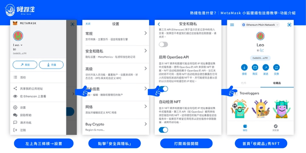 打开MetaMask App 后,先确保你切换至以太坊区块链;在左上角点击「三条杠」图示以展开更多选项,选择「设置」并进入「安全和隐私」子目录,打开「启用OpenSea API」与「自动检测NFT」两个开关,便可在钱包中「收藏品」查看拥有的ERC-721 及1155 NFT。