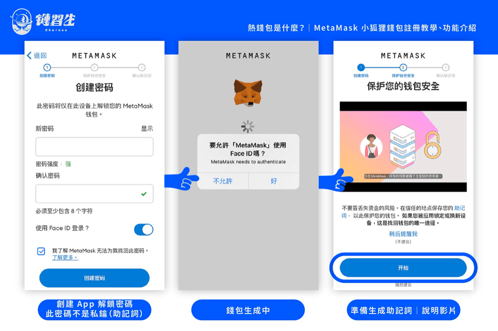 步骤一:创建新钱包接下来我们要创建密码,注意这只是「解锁App 萤幕」用的密码,而不是助记词;也可以一并使用Touch ID/Face ID 功能,代替这组密码。