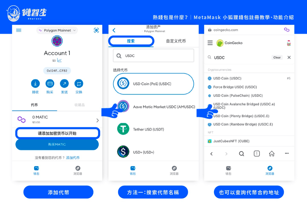 步骤四:添加**by CoinGecko这里我们以在Polygon 区块链上添加USDC 为例。于 CoinGecko 里查询关键字USDC,页面往下滑从「合约」栏位点击右侧「?」找到USDC-Polygon **合约地址(也就是在Polygon 区块链上面的USDC **合约地址),按下「Clike to Copy」复制**地址;回到刚才提到的「自定义**」区贴上**地址,其余栏位将自动侦测带入,大功告成。