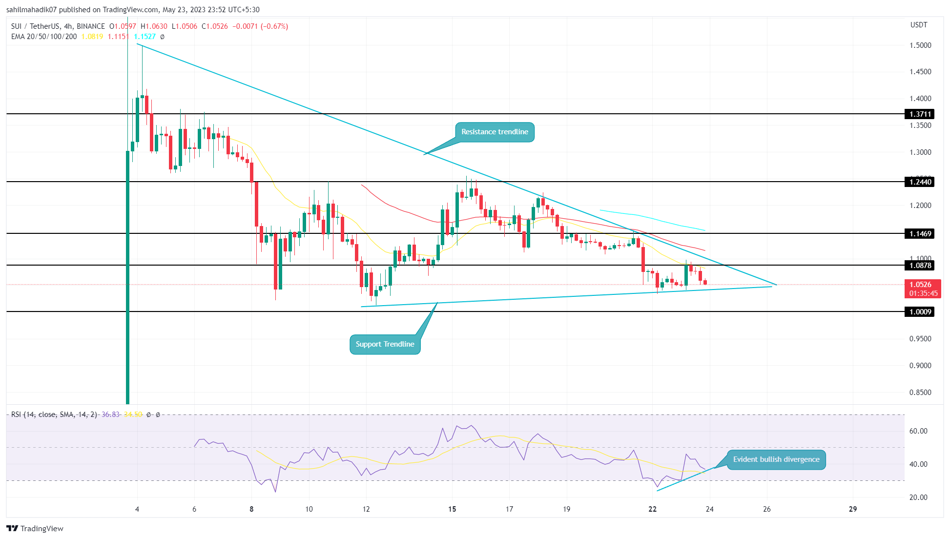 SUI **价格目前交易于 1.058 美元大关,并继续在趋同趋势线内收窄。随着价格越来越接近三角形峰值,决定性突破的可能性也越来越近。