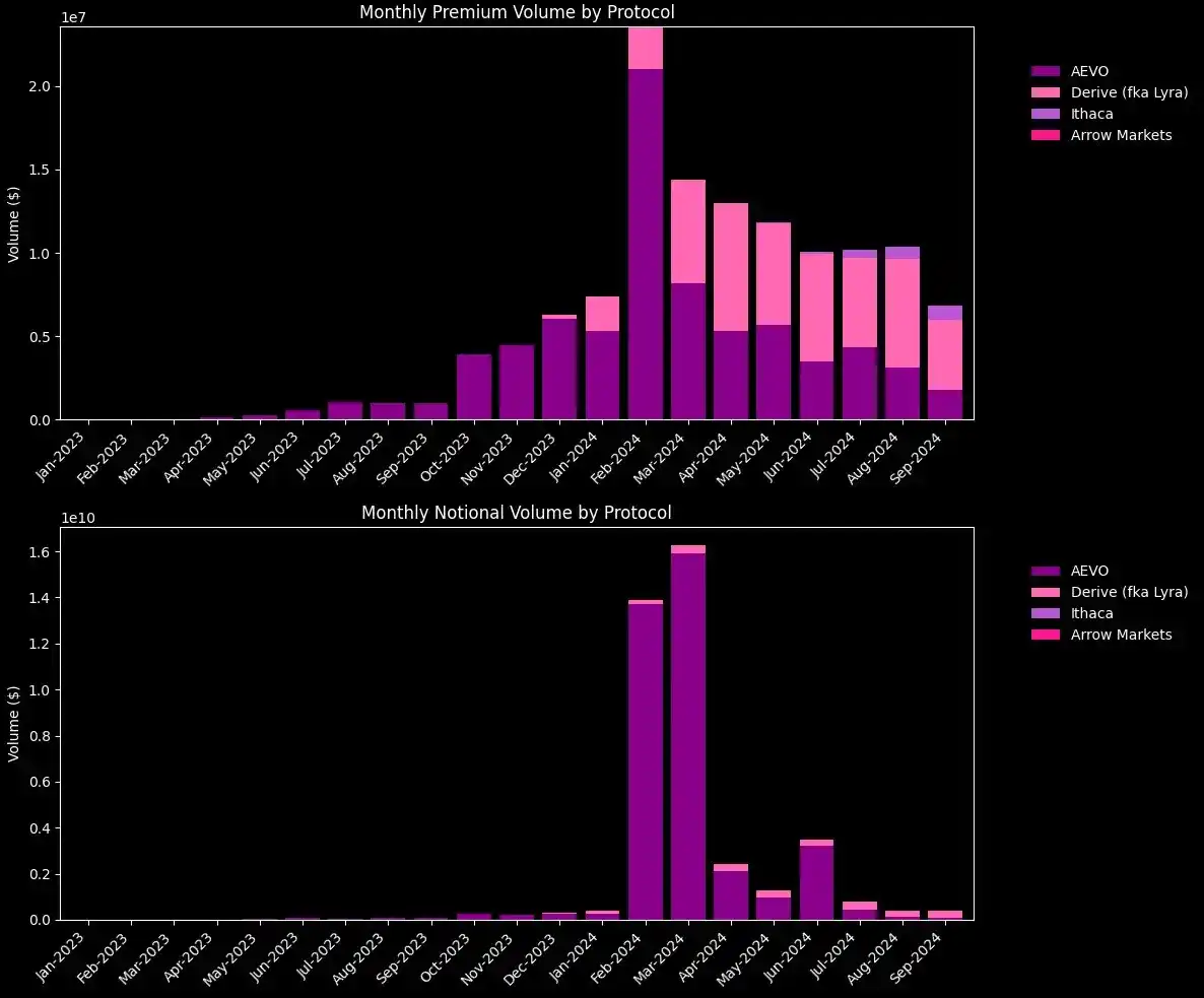 然而,到 2024 年,情况开始发生变化。新的交易所和产品的引入,如 AEVO、Derive(Lyra 的应用链)和 Stryke 等,帮助重新激起了人们对该领域的兴趣,逐渐夺回了市场份额。以下为名义交易量数据: