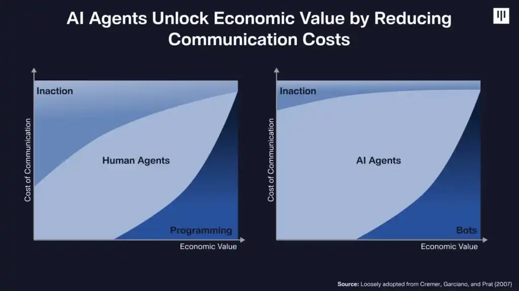 必须提前了解条件(因为你必须对它们进行编程)限制了机器人作为 agent 的实用性。然后,仅仅因为必须对机器人进行编程这一事实就意味着它对于那些不编程的人来说是遥不可及的。我们将转向 AI agent 建模为这些沟通成本的**和相应的经济价值的释放。