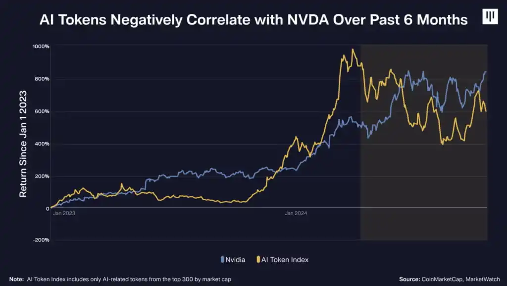 通过充当 AI 的重要和可靠输入以及分布式 AI 协调和交易的轨道,加密货币更接近于保守的「铁锹和镐」对 AI 的押注。这可能会让那些将 Crypto x AI 主要视为 AI 潜在增长的波动性代理的投资者感到惊讶。但有趣的是,在过去六个月中,将英伟达视为 AI 增长情绪的代理,加密货币看起来更像是对冲 AI 增长情绪,而不是高贝塔值投资。