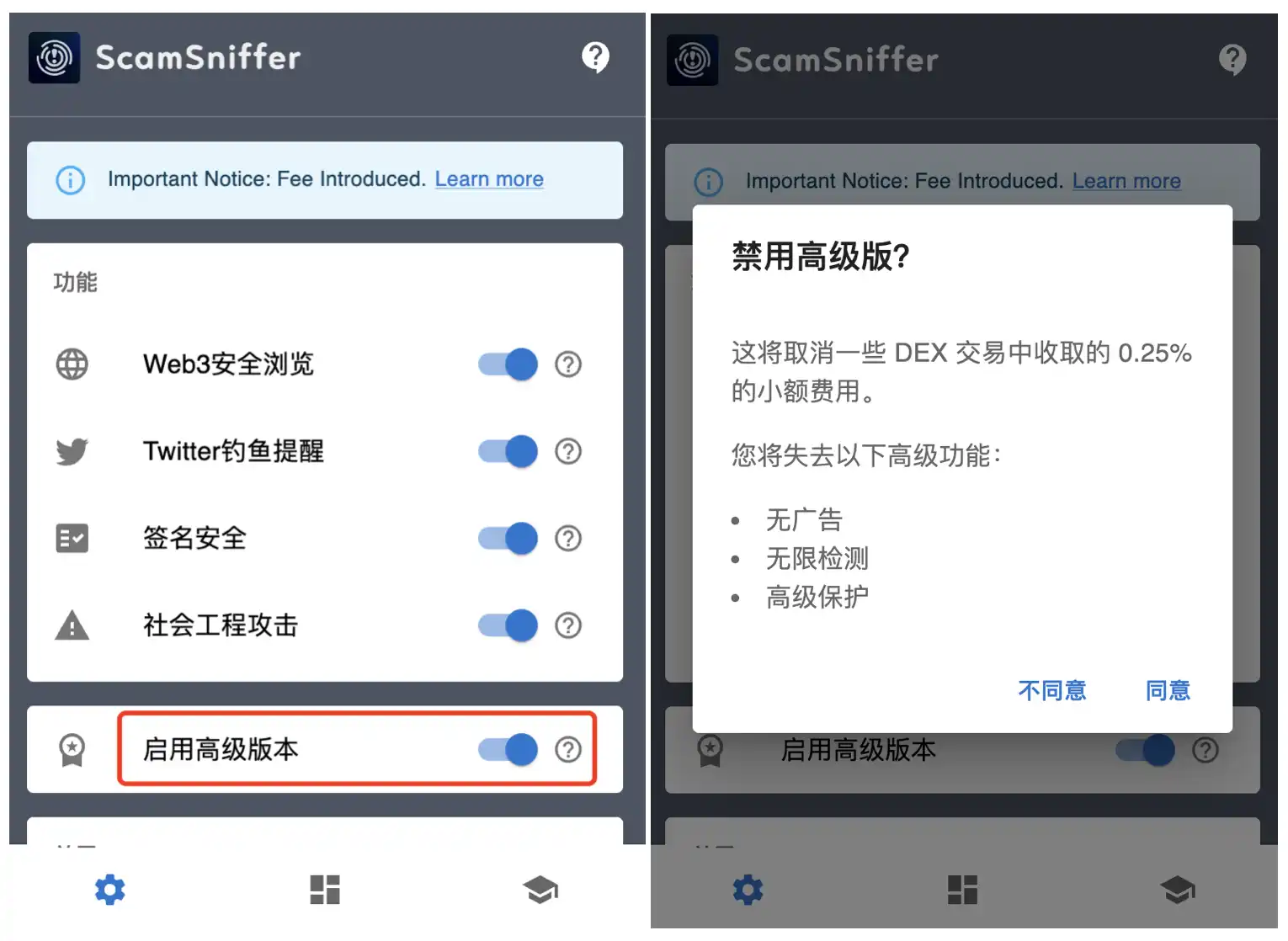 Scam Sniffer 官方文档显示,插件通过在 Uniswap 通用路由器交易中无缝集成一个自定义指令来实现收费功能。针对特定 DEX,比如 Uniswap 和 Pancake 交易,将收取 0.25% 的费用。如果用户禁用「启用**计划」选项,将导致一些功能不可用,包括去广告、更少的检测次数以及更**别的安全保护。