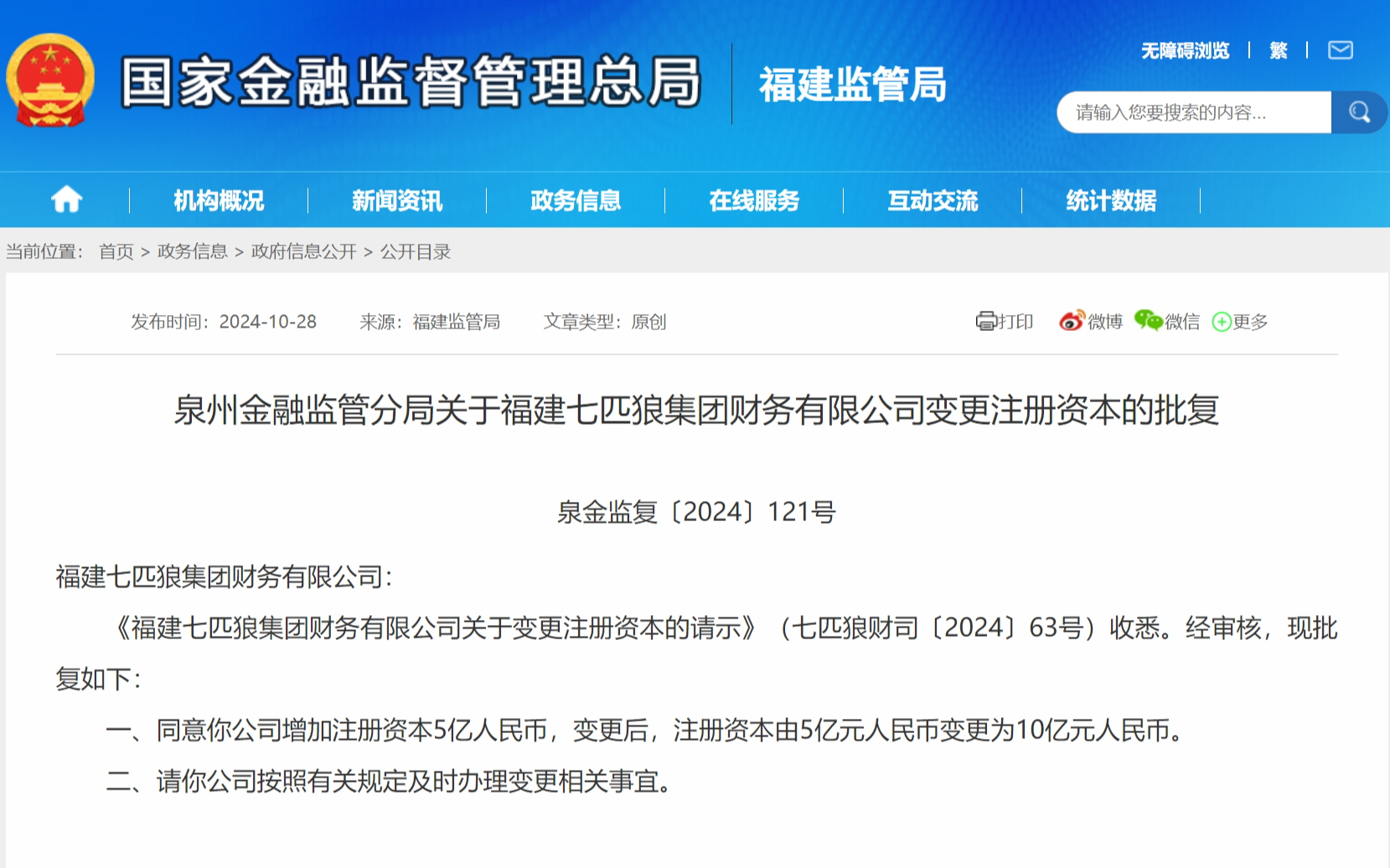 财经10月30日讯 日前, **金融监督管理总局泉州监管分局公布相关批复信息,同意福建七匹狼集团财务有限公司(简称:七匹狼集团财务公司增加注册资本5亿元,变更后,注册资本由5亿元变更为10亿元。以下是相关批复正文: