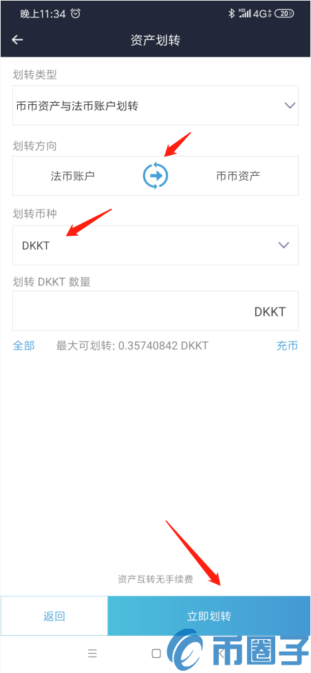 2.进入划转页面后切换划转方向:法币账户 ⇌ 币币资产,选择划转币种,输入划转的数量,**点击下面的【立即划转】即可将法币账户资产划转到币币账户中。