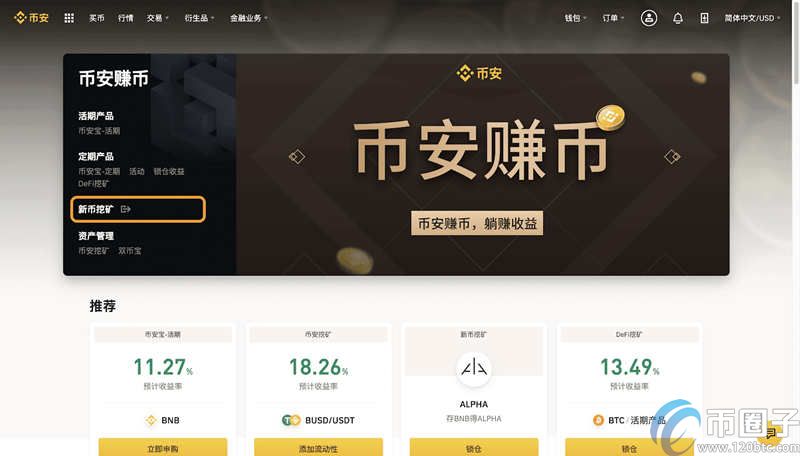 3.此外,您也可以点击浏览器导航下的【金融业务】【币安赚币】,点击【新币挖矿】可查看相应项目。
