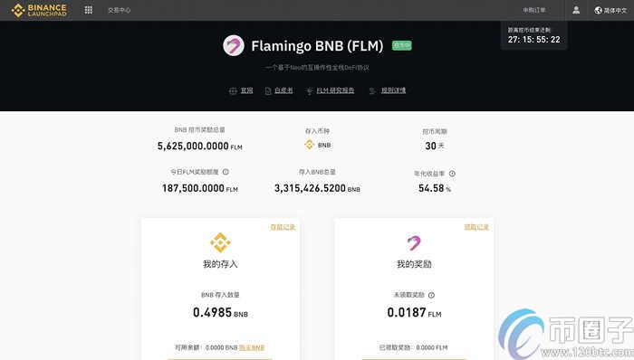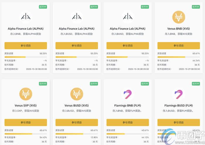 4.下面以“Flamingo BNB” 为例说明可如何使用新币挖矿。新币挖矿的页面卡片上列有存入哪种数字资产,参与挖矿的说明。“存入BNB获得FLM奖励”代表您可通过存入BNB来进行新币FLM的挖矿。单击【参与项目】即可进入对应新币挖矿页面。